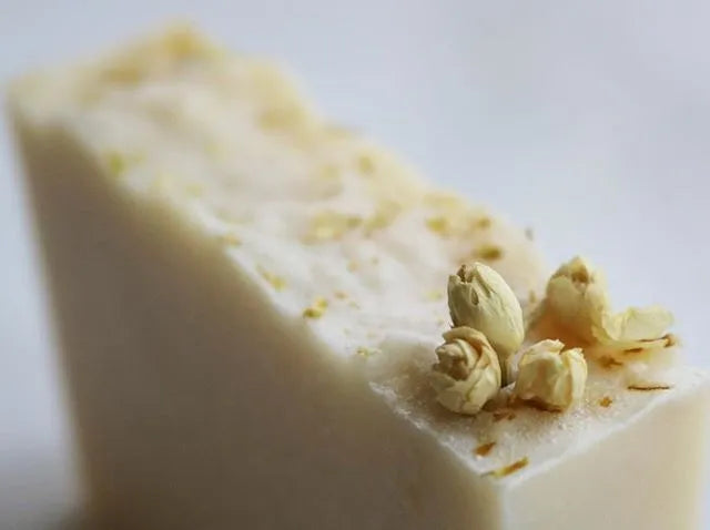Made with saponified oils of olive, coconut, sustainable palm, avocado butter, Shea butter, jojoba, fragrance and topped with jasmine flower.